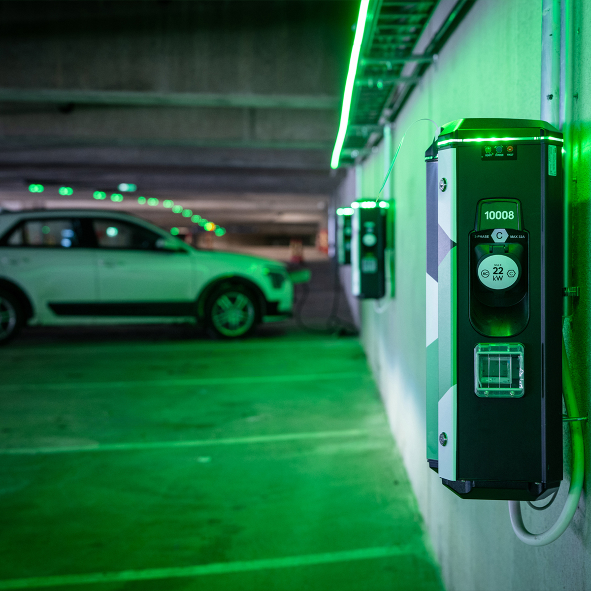 2. Kytke latauskaapeli latauspisteeseen ja ajoneuvoon. Paina Aloita. Lataus alkaa.