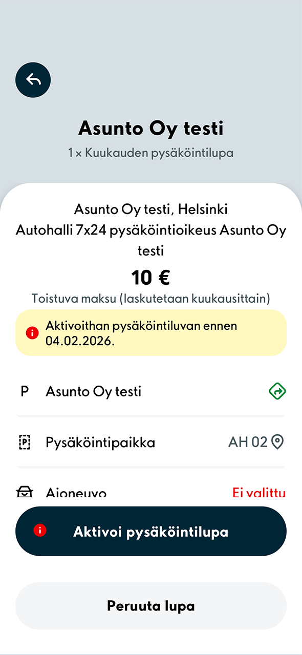 2. Tarkasta, että luvan tiedot ovat oikein ja valitse Aktivoi pysäköintilupa.