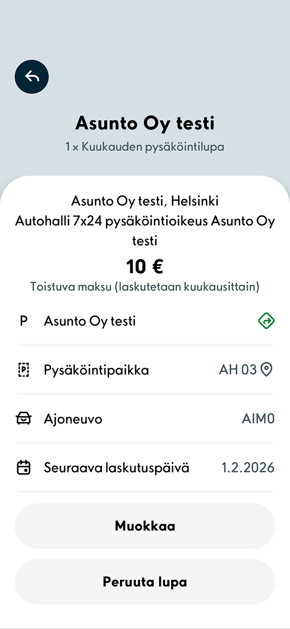 2. Voit vaihtaa ajoneuvon tai maksukortin valitsemalla Muokkaa lupaa. Jos haluat peruuttaa luvan kokonaan, valitse Peruuta lupa.